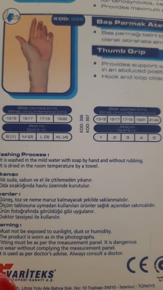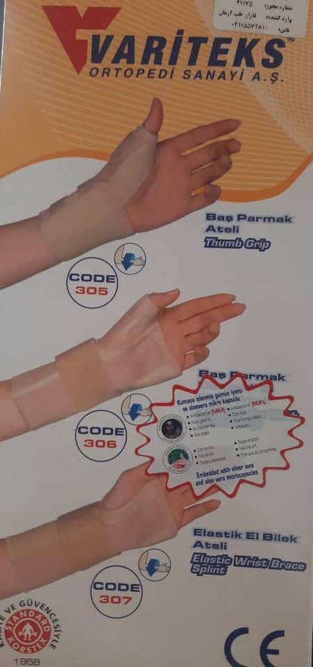 مورد استفاده : برای التهاب تاندون اشیل و سندوم تونل کارپال تکیه گاهی برای مچ دست ایجاد می کند - در مواردی که شست و مچ دست پس از گچ گیری و جراحی نیاز به استراحت دارد ، موارد دکواماسیون و اختلالات تونل کارپال مشخصات : تقویت شده با دو پایه های آلومینیومی برای انگشت شست و مچ دست -